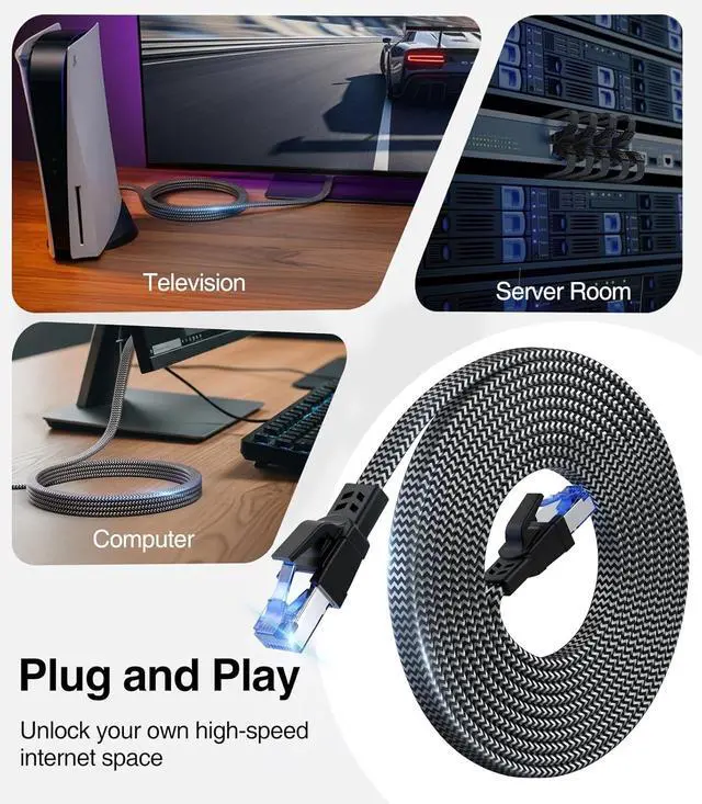 [Excellent Anti-interference, Smooth Online Experience] Our Cat 8 Internet cable is built with 100% oxygen-free copper core, advanced 4 shielded foiled twisted pairs (F/FTP), and gold-plated RJ45 connectors to actively fights interference and crosstalk, ensuring your connection remains stable and swift. Plus, it ready to connect your entire home or office ecosystem, from routers and gaming consoles (PS, Xbox) to smart TVs, IP cameras, and legacy devices using Cat 5/6/7 cables.