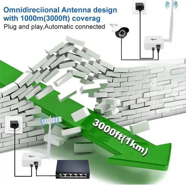 Extended Network Coverage: With a range of up to 1KM, it is an ideal solution for seamlessly connecting distant buildings, barns, shops, farms, garages, warehouses, or security cameras.