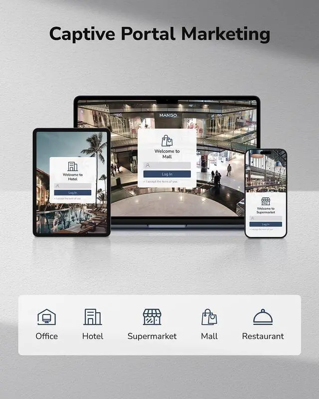 Enhance brand visibility with a customized login page. Captive portal lets you engage new users instantly and promote your brand as they connect to your network.