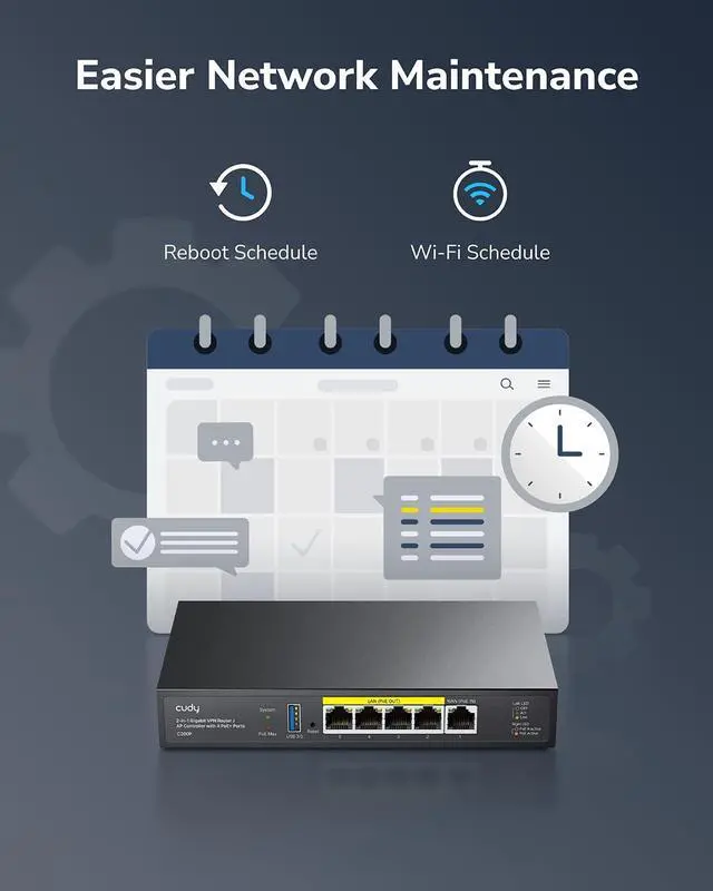 Centralized AP Management Customized Captive Portal for Guest Network Easier Network Maintenance Multi-Device Network Maintenance Smart Scheduling Flexible Traffic Control Compact Desktop Design