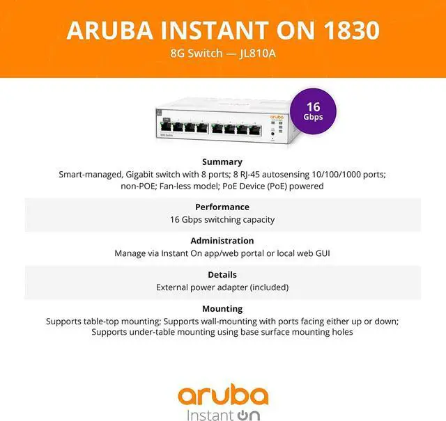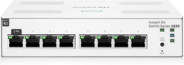 VERSATILE SMART-MANAGED SWITCH: The Instant On 1830 8G switch is a smart-managed, easy-to-deploy Layer 2 gigabit Ethernet switch with fast set-up, easy management, and security designed for small businesses with evolving network demands. It can be powered by an external power adapter or an upstream Power over Ethernet (PoE) switch for environments where no line power is available