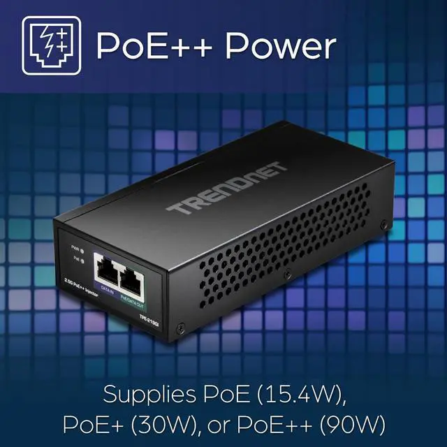 POE++ POWER: The 2.5G PoE++ injector supplies a PoE device with PoE ( 15.4W ), PoE+ (30W), or PoE++ (90W) power