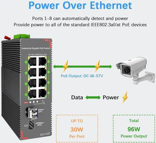 96W PoE OutputThe total power output of this industrial PoE switch is 96W for 8 PoE ports, can up to 30W each port. The PoE DC Output is the standard 48V, don' t work with 12V. Work with IEEE 802.3 af/at PoE compliant PDs.