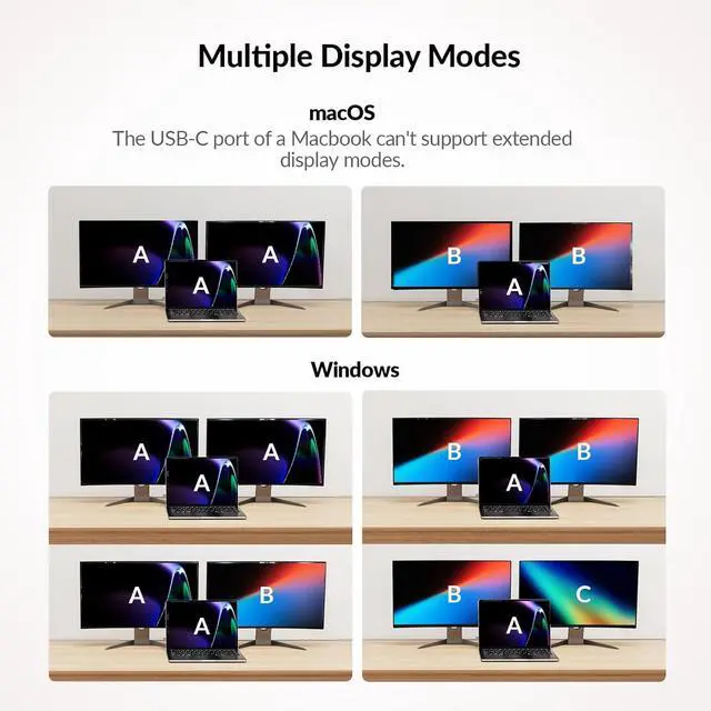 Q: My MacBook only outputs mirrored dual screens but can't output extended dual screens. Why is that? A: MacBook's USB-C port itself only supports single stream transport (SST), not multi stream transport (MST). Thus, the dual screens can only display in mirror copy mode. If you need extended dual screen output with your MacBook, please let us know.