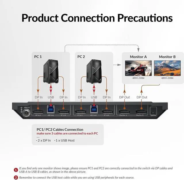 Maximize Your Productivity with a 8K KVM Switch Dual Monitors KVM Switch 2 Computers 2 Monitors DisplayPort Immersed in 8K UHD Resolution High Refresh Rates, Amazing Gaming Experience Automatic PC Wake-up Function