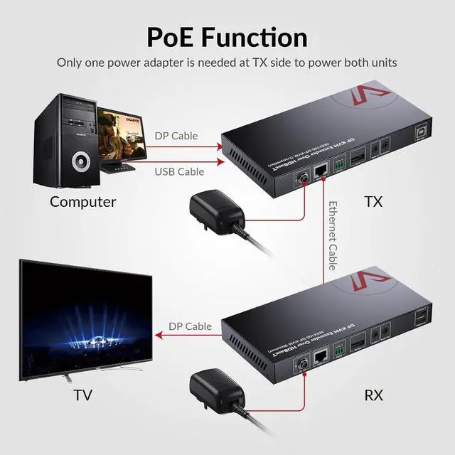 Extend DisplayPort Signal Up to 100m/330ftTransmit 4K@30Hz or 1080P up to 100m over a single Cat5e/6/6a/7 cableperfect for long-distance setups without signal degradation.