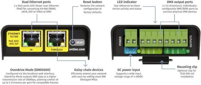 ENTTEC DIN Ethergate Mk2 POE 71031 2 Universe Bi-Directional Ethernet to Dual DMX RDM Converter, DMX500K Compatible