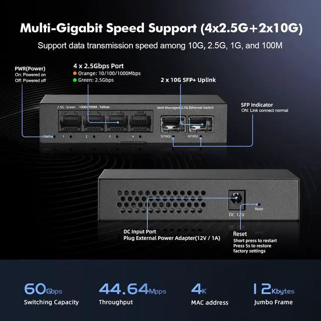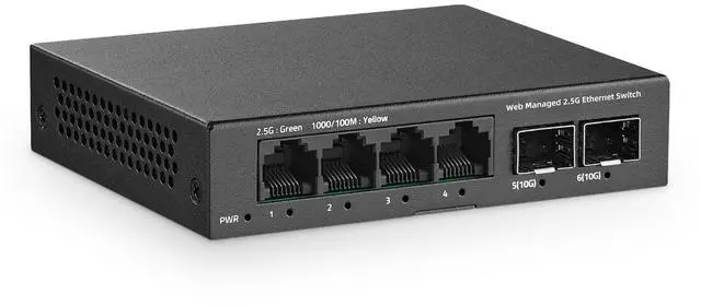 | Indicator | PWR On: Powered on, Off: Powered off, 1-4 port Green Light On:2.5G Link normal, Yellow Light On:10/100/1000Mbps Link normal, Off: Link blocked, Flashing: Data transmitting, 5-6 SPF+ port Blue Light On:10G Link normal, Green Light On:2.5G Link normal, Off: Link blocked, Flashing: Data transmitting |
