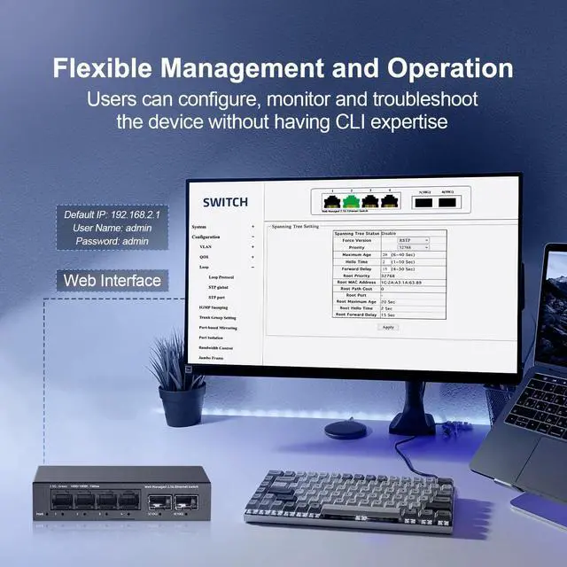 Accessible via Web GUI, equip your business with network capabilities such as VLANs, STP, LACP