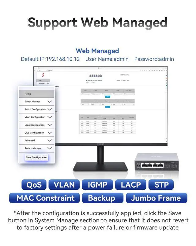 Set your network IP to 192.168.10.X (X=2-254, excluding 12) and subnet mask to 255.255.255.0. Enter 192.168.10.12 in your browser. Log in with the default credentials ("admin") to access the management interface.
