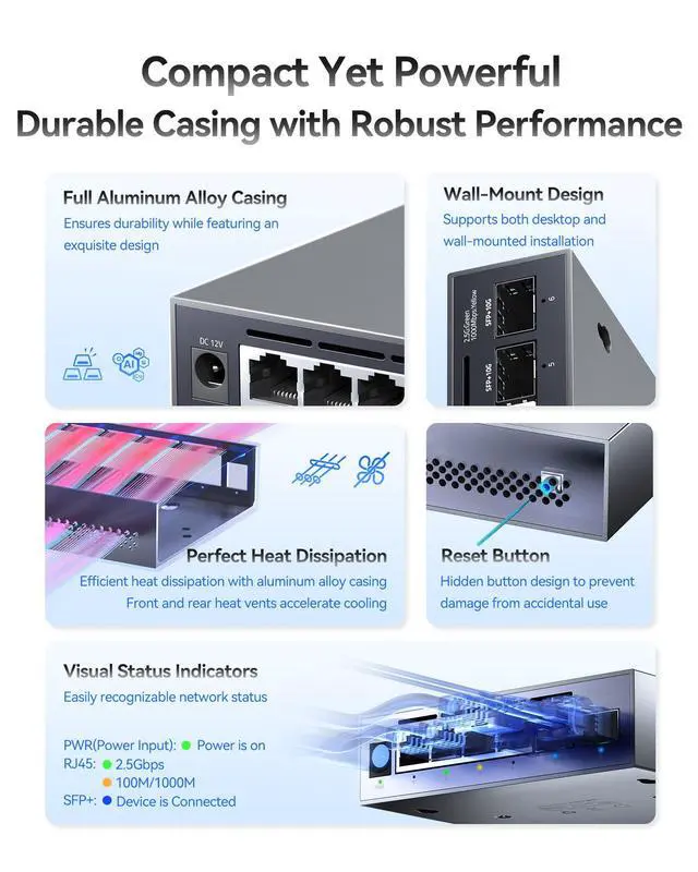 | 4*2.5G RJ45 & 2*10G SFP+ | 5*2.5G RJ45 & 1*10G SFP+ | 8*2.5G RJ45 & 1*10G SFP+ | 4*2.5G RJ45 PoE+ & 2*10G SFP+ | 8*2.5G RJ45 & 1*10G SFP+ | 8*2.5G RJ45 & 4*10G SFP+ | 8*10G SFP+ |