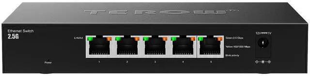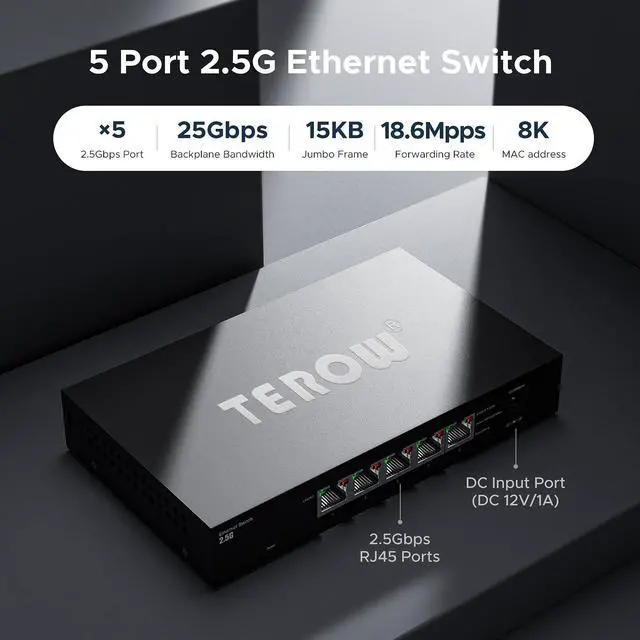 5 Port 2.5G Ethernet Switch, 5 x 2.5G b RJ45 Base-T Ports, Plug & Play/Fanless Metal Design 2.5G be Ethernet Unmanaged Network Switches, TEROW 5 Port 2.5GB Switch