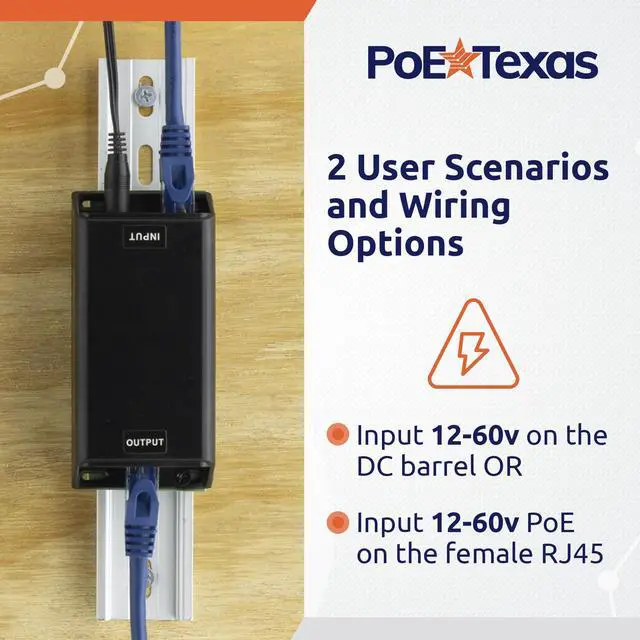 1. Convert 12-60v of a DC power source to a regulated 50 volts of PoE+ via the 2.1 x 5.5 mm DC female connector INPUT.
