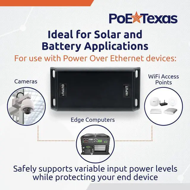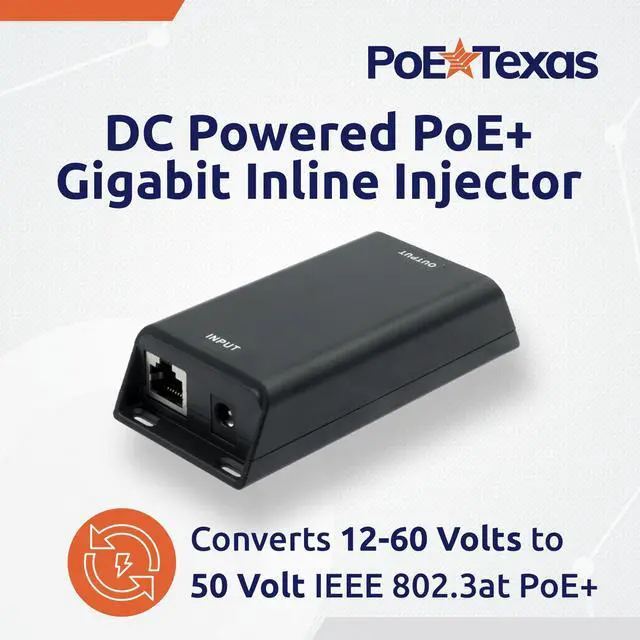 Use this inline gigabit PoE injector with any unregulated DC power source from 12 volts up to 60 volts (IN) to deliver a regulated 50-volt Active PoE+ up to 30 watts of power (OUT) for WiFi, cameras, or PoE devices. Perfect for solar and battery applications.