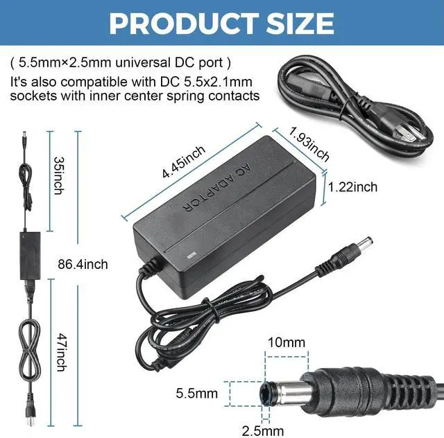 Conector size: 5.5mm x 2.5mm, compatible with 5.5mm x 2.1mm