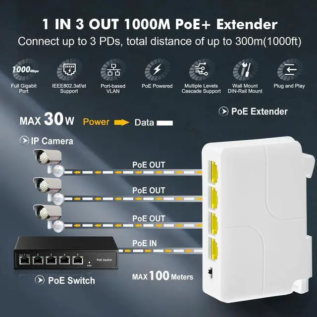 1 in 3 out PoE extender compatible with IEEE802.3af/at standard, It determines and delivers the exact power supply to your devices with up to 30W power output.
