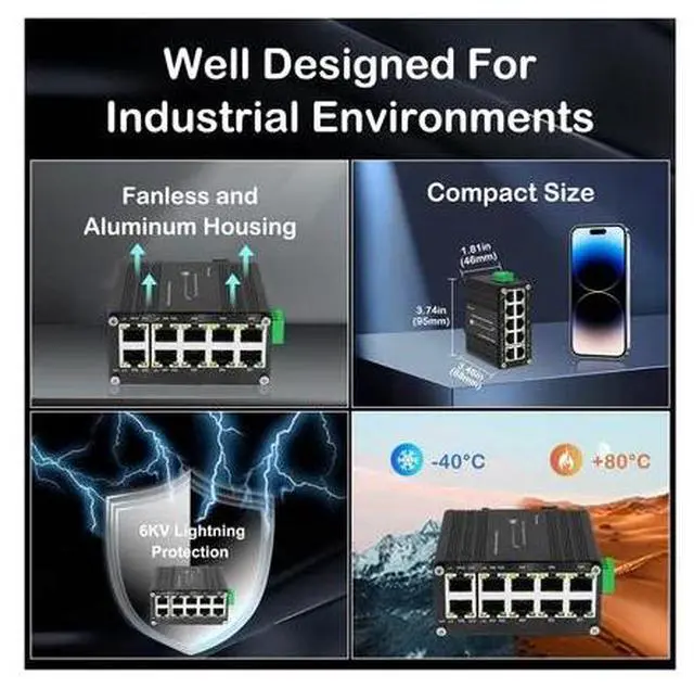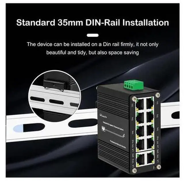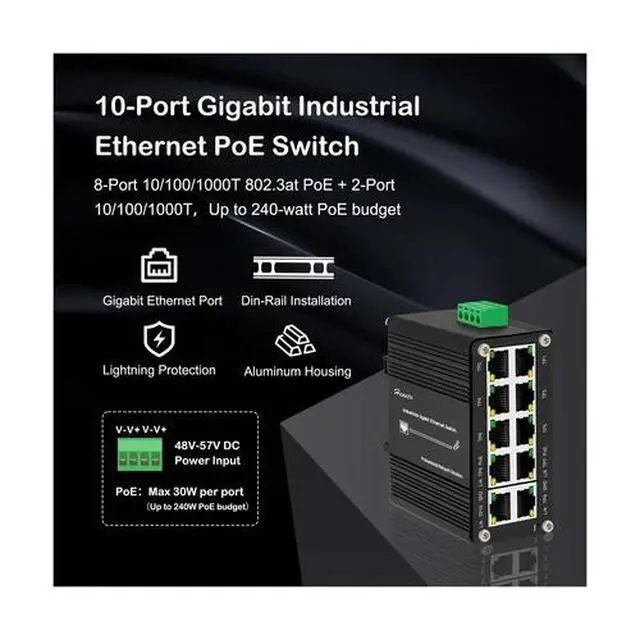 The Industrial Gigabit 10-Port Ethernet PoE+ Switch is engineered for robust performance in demanding environments. Featuring 8 Gigabit 10/100/1000Base-T RJ45 ports with Auto MDI/MDI-X and 2 additional uplink ports, all 10 ports support uplink connectivity, making it highly versatile for network expansion. This switch is equipped with redundant DC12-48V power inputs, ensuring uninterrupted operation through dual industrial-grade power interfaces. With an IP40-rated aluminum alloy enclosure, it withstands extreme temperatures from -40°C to 80°C and provides 6KV lightning protection for enhanced durability. The integrated 35mm DIN rail mounting bracket allows for secure and efficient installation in industrial settings. Ideal for surveillance, industrial automation, and smart city applications, this switch delivers reliable, high-speed networking where it is needed most.