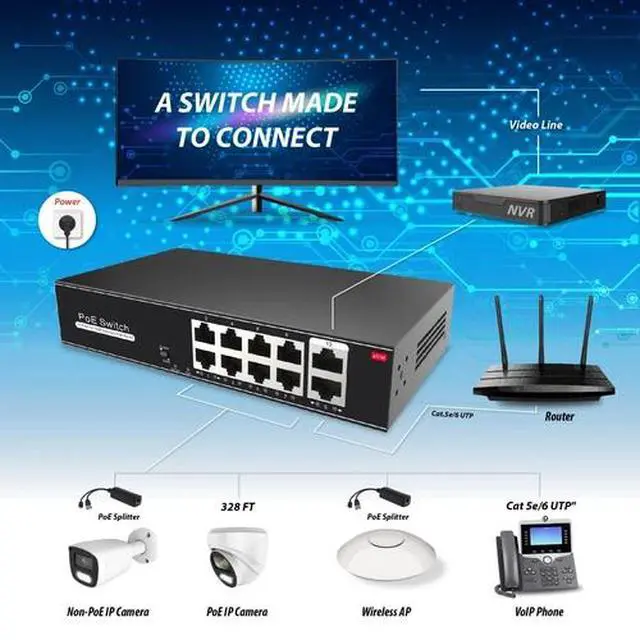 The 8-Port Gigabit PoE Network Switch with 2 additional uplink ports is engineered for reliable and efficient power and data delivery across your network. Featuring 8 PoE+ (802.3at/af) Gigabit RJ45 ports, each capable of supplying up to 30W, this switch supports a total PoE power budget of 65W and a robust 16 Gbps switching capacity. The innovative Extend Mode enables PoE transmission up to 820 ft, making it highly suitable for expansive surveillance or large-scale device deployments. With PoE Auto Recovery, the switch automatically reboots unresponsive PoE devices, ensuring maximum uptime. Its plug-and-play design eliminates the need for complex configuration, while the fanless, sturdy metal housing ensures silent operation and durability. The compact, desktop or wall-mountable form factor (5.16 x 7.72 x 4.76 in.) offers flexible installation options for both home and business environments.