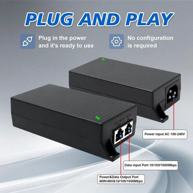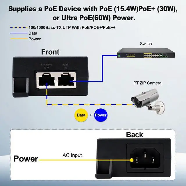 PoE Injector++ Simultaneously Transmits Data and Powers a Standard PoE Device (60W Max.) Through One Ethernet Cable, Ideal for Surveillance, Wi-Fi Coverage, and More Applications.
