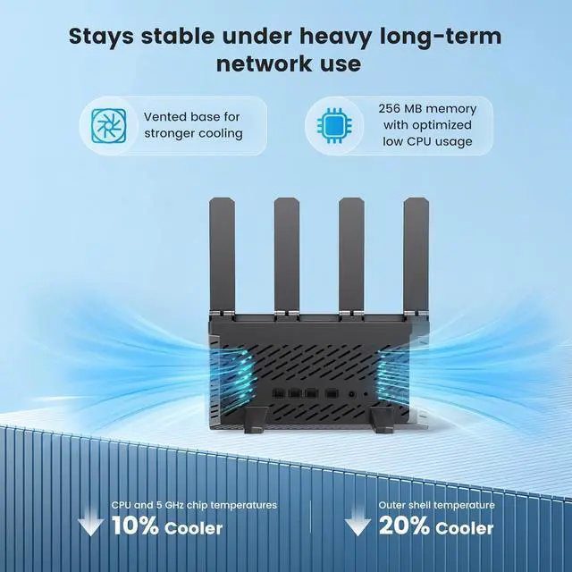 Optimized CoolingOur unique vertical,hollow design isn't just for looksit's engineered for superior airflow and heat dissipation. This advanced thermal architecture effectively lowers the operating temperature by up to 20% compared to traditional bulky routers, preventing overheating and throttling. Enjoy consistently reliable performance, ultra-low latency for gaming/video calls, and a network that stays online without unexpected drops.