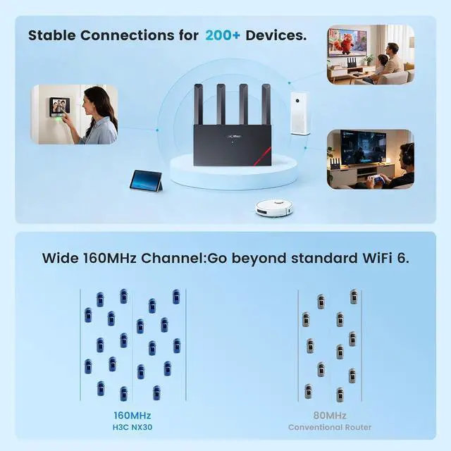 Powerful HardwarePowered by a robust Qualcomm professional-grade chipset and an independent NPU (Network Processing Unit), this router efficiently manages network traffic, boosting data processing speeds by up to 10%. Coupled with ample 256MB of memory, it ensures rock-solid stability while connecting up to 200+ devices. Perfect for today's smart homes filled with phones, tablets, TVs, cameras, and IoT devices, all running smoothly at the same time.