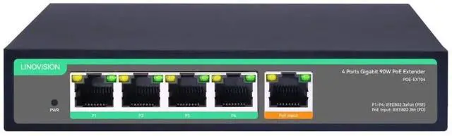 LINOVISION 4 Ports Gigabit PoE Passthrough Switch and PoE Extender with 90W PoE Input, IEEE 802.3 af/at/bt PoE Repeater, 1 in 4 Out POE Bosster, PoE Powed Switch for IP Cameras, IP Phone