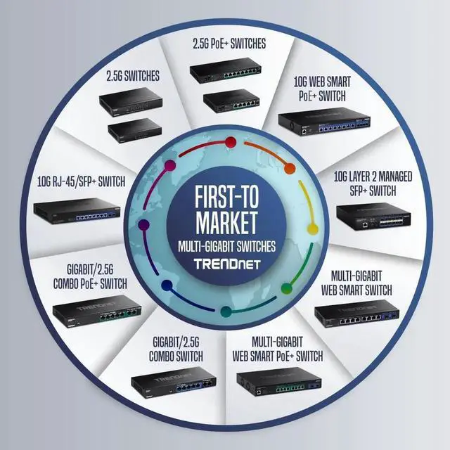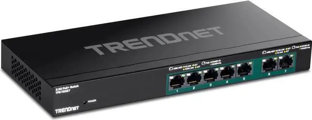 TRENDnets 7-Port Multi-Gig PoE+ Switch, model TEG-TG327, is an affordable 2.5G PoE+ switch that provides advanced high bandwidth performance, ease of use, and reliability. The TEG-TG327 multi-gig switch offers two dedicated 2.5G PoE+ ports and five dedicated 1G PoE+ ports for high-speed network connections with a 20Gbps switching capacity. Having a sturdy compact metal housing and fanless design, the multi-gig PoE+ switch is a cost-effective solution for high-speed network connections. A 70W total PoE power budget on this affordable multi-gig PoE+ switch supplies up to seven PoE+ devices with up to 30W per port.