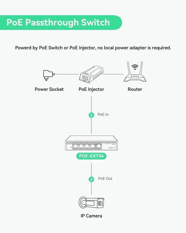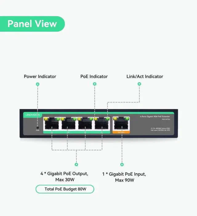 LINOVISION 4 Ports Gigabit PoE Passthrough Switch and PoE Extender with 90W PoE Input, IEEE 802.3 af/at/bt PoE Repeater, 1 in 4 Out POE Bosster, PoE Powed Switch for IP Cameras, IP Phone
