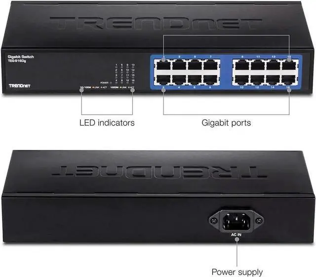 16 gigabit ports provide high-speed network connections to devices and a 32 Gbps switching capacity allows data traffic to flow smoothly, reducing traffic bottlenecks.