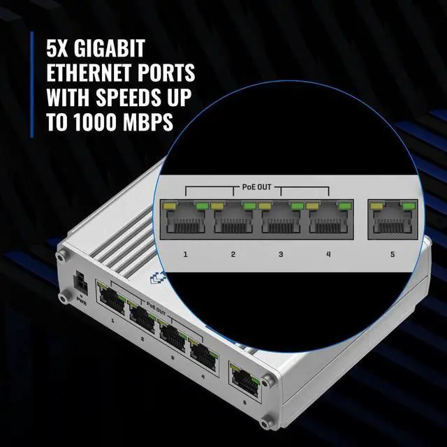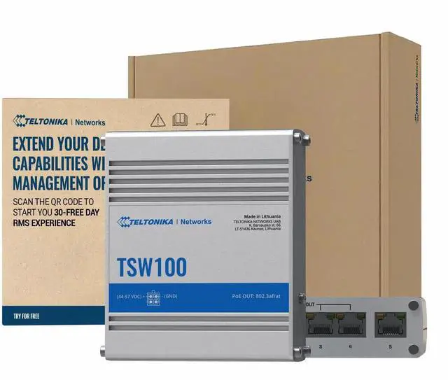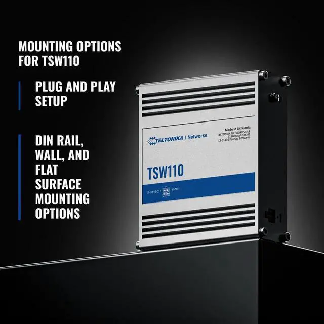 Teltonika TSW100 Industrial PoE+ Unmanaged Ethernet Switch - 4X PoE+ Ports & 120W Power Budget - 5 Port Gigabit Switch with High Speeds Up to 1000 Mbps - DIN-Rail PoE Switch IP30 Rated, Plug & Play