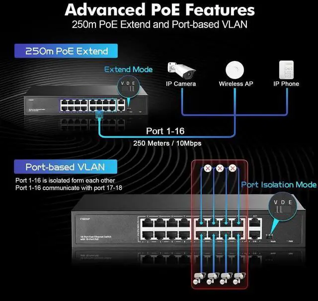 • Vlan Isolation & Extend DistancePorts 1-16 support VLAN port isolation and cannot communicate with each other, only communicate with uplink port 17-18 port, which can reduce network congestion, improve performance and safety; ports 1-16 support POE distances up to 250 meters, the rate is 10Mbps.