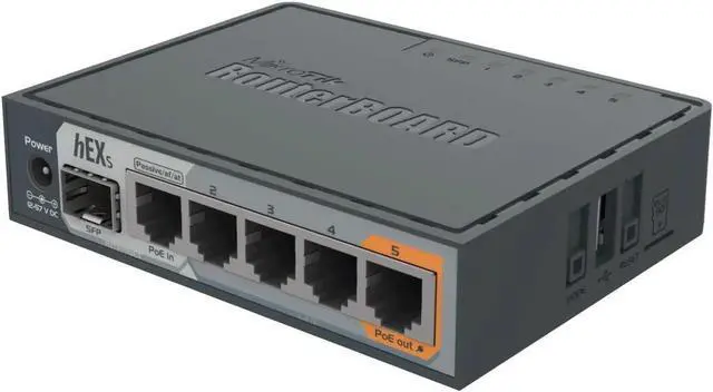 High-Performance Wired Router Powered by a dual-core 880 MHz CPU and 256 MB RAM, the hEX S is built for advanced networking, handling IPsec hardware encryption up to 470 Mbps and complex RouterOS configurations with ease. Gigabit Speeds & Fiber Ready Includes five Gigabit Ethernet ports plus one 1.25G bit/s SFP port for fiber connectivity, ideal for homes or offices needing fast, stable wired networking without Wi-Fi. Power Over Ethernet Output Port #5 supports passive PoE output (up to 57V), allowing you to power other MikroTik devices directly, simplifying your installation setup.
