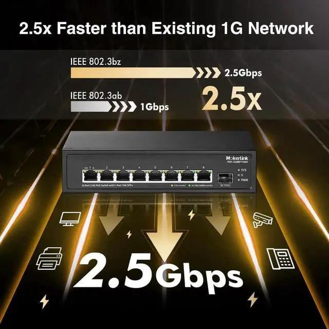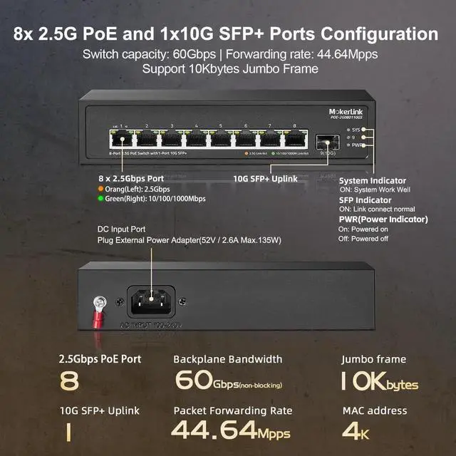 MokerLink 8 Port 2.5G PoE Switch with 10G SFP+ Slot, 8 x 2.5G Base-T Ports Compatible with 10/100/1000Mbps, IEEE8023af/at PoE 135W, Metal Unmanaged Fanless Small Network Switch