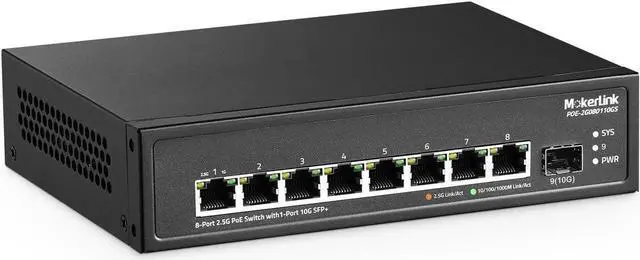 MokerLink 8 Port 2.5G PoE Switch with 10G SFP+ Slot, 8 x 2.5G Base-T Ports Compatible with 10/100/1000Mbps, IEEE8023af/at PoE 135W, Metal Unmanaged Fanless Small Network Switch