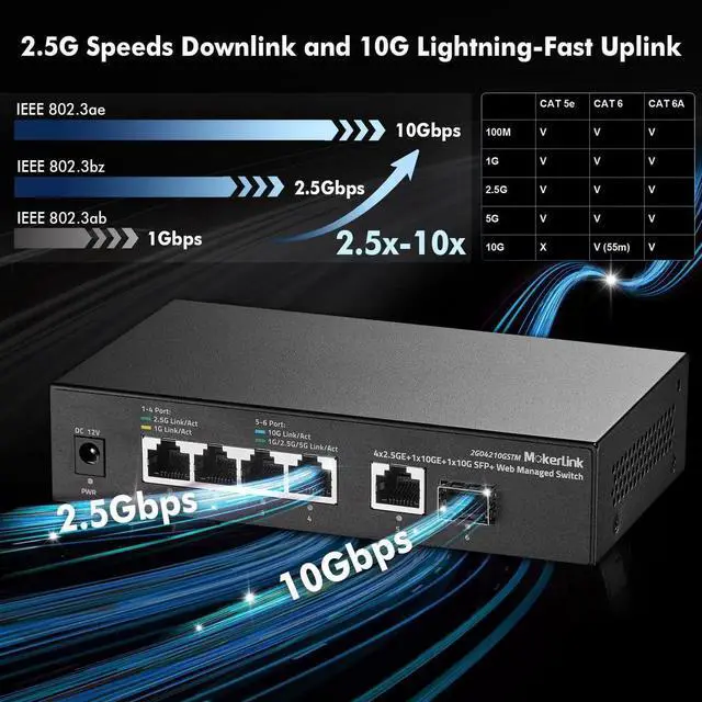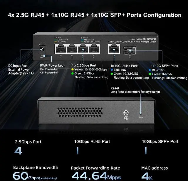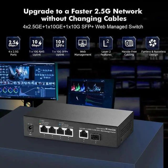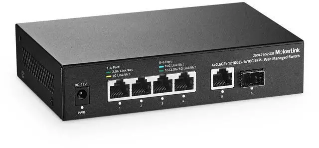 MokerLink 10G Easy Web Managed Switch, 4x 2.5G, 1x10G RJ-45 Base-T, 1x10G SFP, Support LACP/VLAN/QOS/IGMP, Metal Web Managed Fanless Network Switch