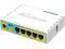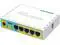 hEX PoE lite is a small five port ethernet router in a plastic case, it has a USB 2.0 port and PoE output. Ports 2-5 can power other PoE capable devices with the same voltage as applied to the unit. Less power adapters and cables to worry about! Max current is 1A per port, Ethernet ports are shielded. It is affordable, small and easy to use. With its compact design and clean looks, it will fit perfectly into any SOHO environment.