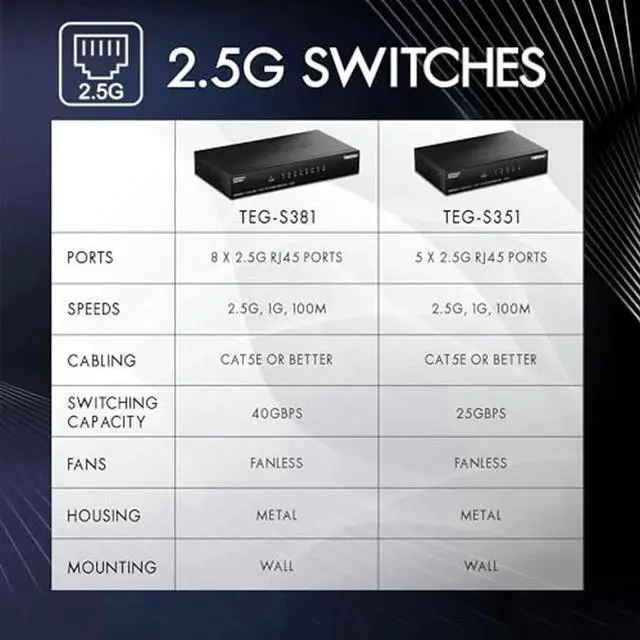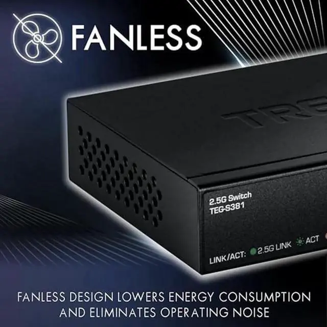Expand your networks bandwidth and reduce bottlenecks with TRENDnets 8-Port 2.5G Switch, model TEG-S381. The 2.5G network switch comes equipped with 2.5GBASE -T RJ45 ports that provide ultra-fast speeds capable of up to 2.5G bps over your existing Cat5e or better cabling. This high-speed 2.5G switch features a durable metal enclosure and can be wall mounted for setup f lexibility. The fanless design lowers energy consumption and eliminates operating noise. TRENDnets reliable 2.5G switch is a cost effective solution to increase your networks throughput.