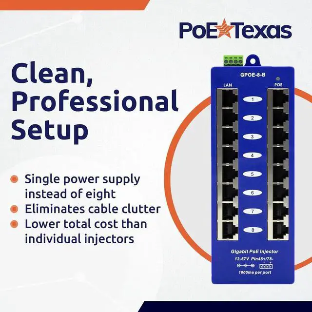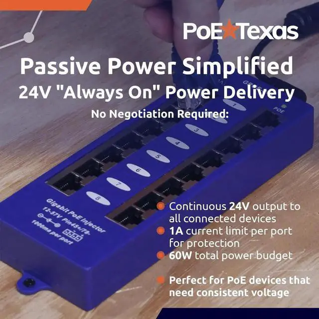 Remove clutter in your installations. Replace up to 8 individual power over ethernet injectors with this single POE module. This device provides power and data on one Ethernet cable using pins +4, 5 and -7, 8 (Mode B). All devices receive the same voltage and will share the available power. Check device specs for individual power consumption of each device. Use with a recommended 24 volt DC power supply for Ubiquiti and Mikrotik 10/100/1000 devices. (Please check manufacturer specs for compatibility)