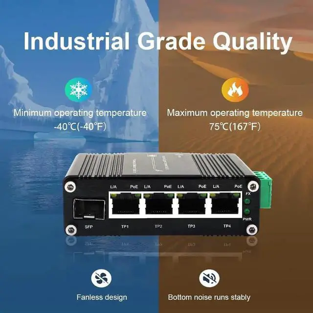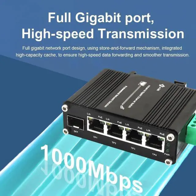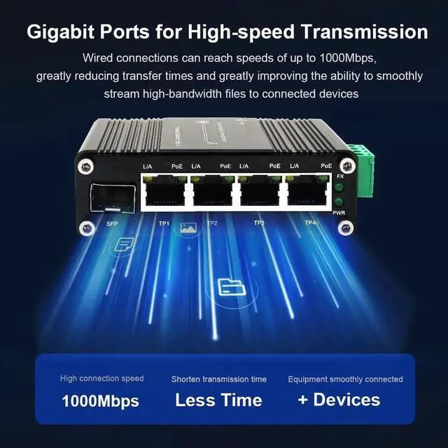 Mini Industrial 4 Port 10/100/1000Mbps Gigabit Ethernet POE + Switch with SFP Port Din Rail/Wall-Mount 4 Port 10/100/1000BASE-T RJ45 + 1 Port 100/1000FX (SFP) Support 12-48V DC