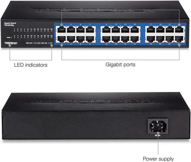 The 24-Port Gigabit GREENnet Desktop Switch, model TEG-S24Dg, provides high bandwidth performance, ease of use, and reliability, all while reducing power consumption by up to 70%. GREENnet technology automatically adjusts power consumption as needed, resulting in substantial energy savings. Embedded GREENnet technology works right out of the box with no management requirement. Boost office network efficiency and eliminate network congestion with Gigabit speeds and a total switching capacity of 48Gbps with full-duplex mode. A built-in universal power supply reduces cable clutter and diagnostic LEDs help with network troubleshooting. Plug and Play this sturdy metal switch for reliable high-speed network connectivity.