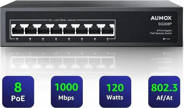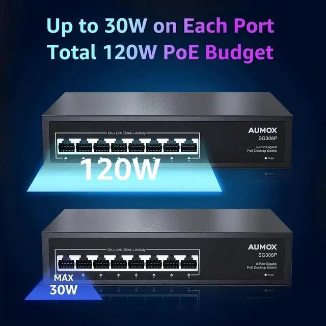 120W poe switchAUMOX network switch equipped with 8 802.3af/at PoE ports with up to 30W for each port, data, and power can be transferred on one single cable.It supports PoE power up to 120W for all PoE ports