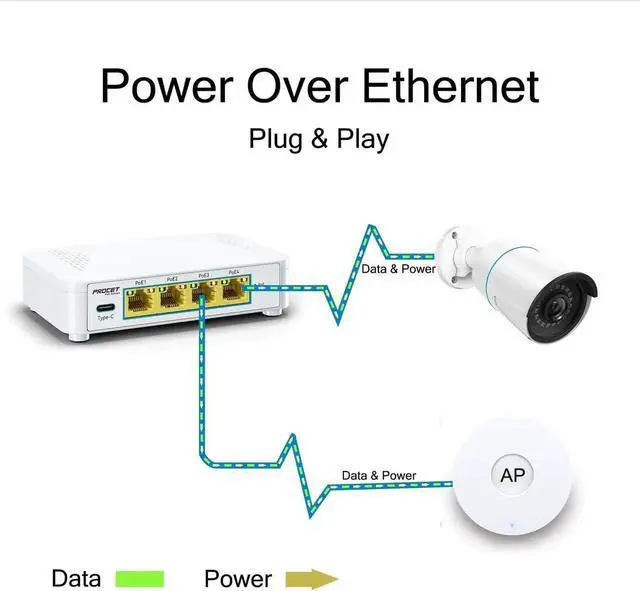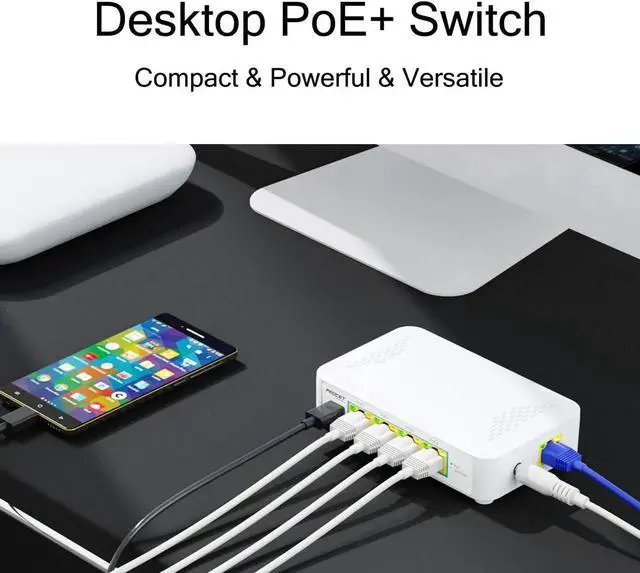 Gigabit 5 Port PoE Switch4x PoE+ (802.3at/af) 10/100/1000 Mbps RJ45 ports providing up to 30W per port and total PoE power budget of 60W, 1 USB-C port 5V2A, together w/ 1x Gigabit Non-PoE Port for high-speed connections.