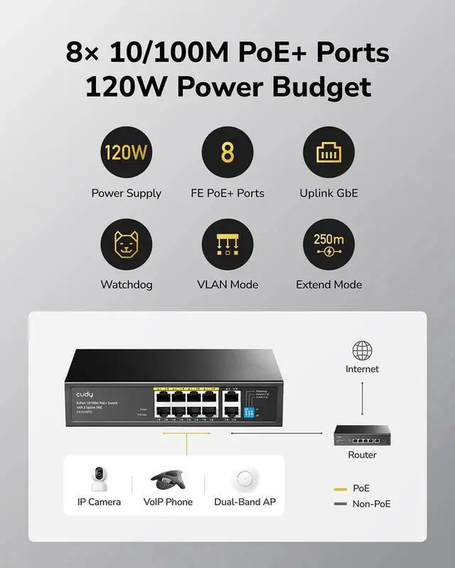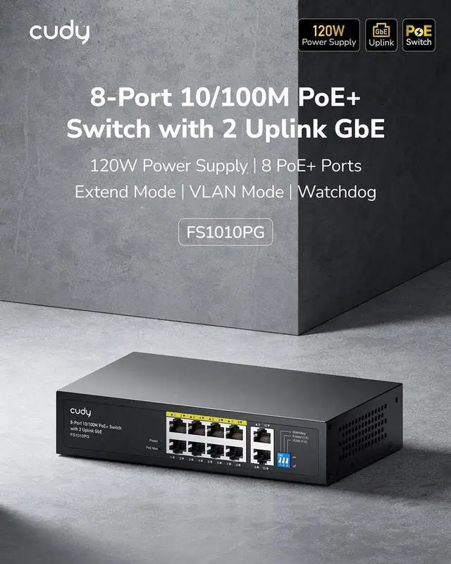 Cudy 8 Port Fast Ethernet 100Mbps PoE Switch 8 PoE+ Ports @120W, Plug & Play Sturdy Metal w/Shielded Ports Extend Mode Priority Mode FS1010PG