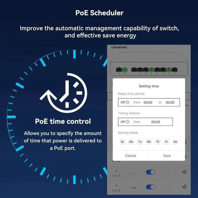 PoE Scheduler Function: With the PoE scheduler, you can plan the days and times during which the switch makes Power over Ethernet available to yo