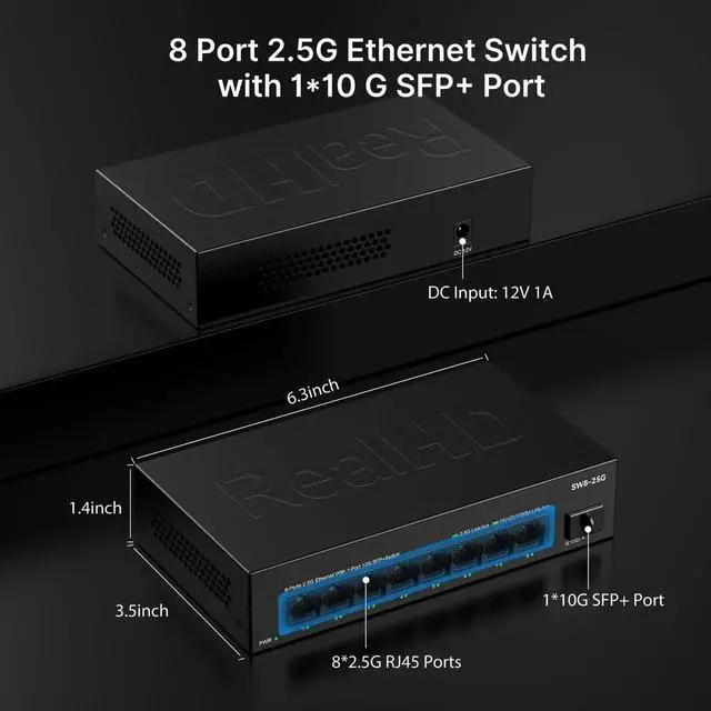 Real HD 8 Port 2.5G Ethernet Switch Unmanaged Network Switch with 8 x 2.5 Gigabit ^^ 1 x 10G SFP+ ^^ Work with 10-100-1000Mbps Devices ^^ 60G Bandwidth ^^ Plug & Play ^^ Fanless Quiet Metal Internet Switch
