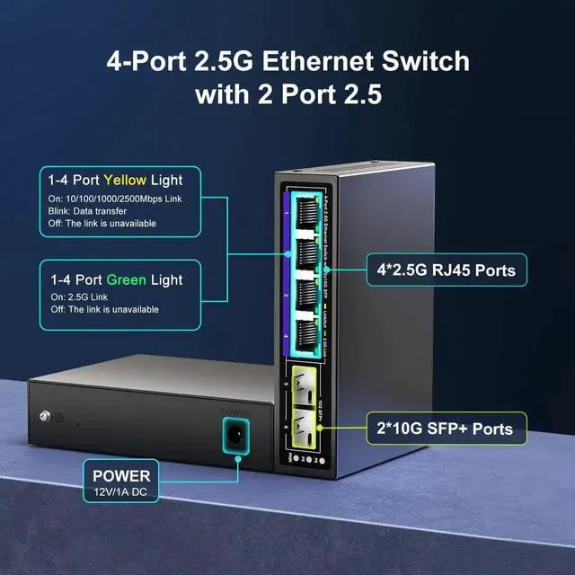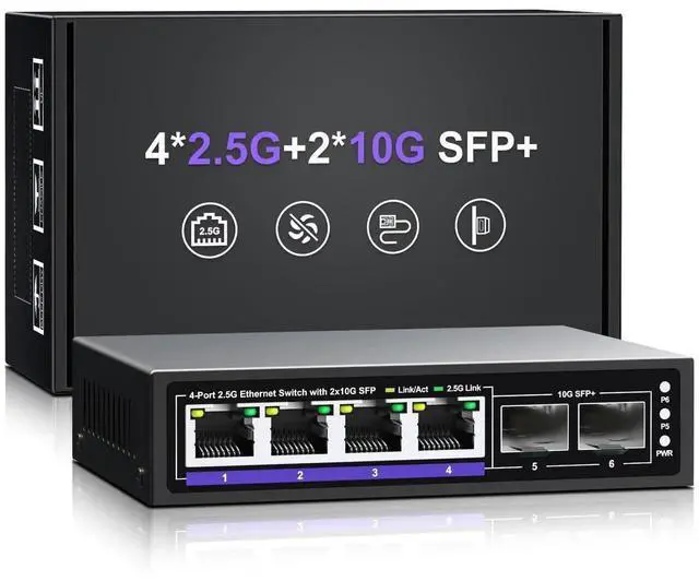 6 Port 2.5G Unmanaged Ethernet Switch, 4 x 2.5G Base-T Ports, 2 x 10G SFP+, Compatible with 100/1000/2500Mbps, Metal Fanless, Desktop/Wall Mount NICGIGA 2.5G be Network Switch for Wireless AP, NAS, PC
