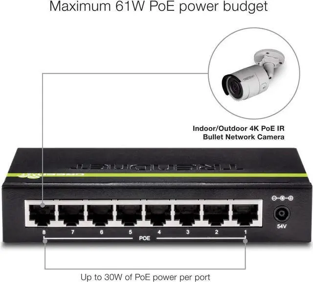 TRENDnet's 8-Port 10/100Mbps PoE Switch, model TPE-S44, offers 4 x 10/100Mbps PoE ports, 4 x 10/100Mbps ports, a 1.6G bps switching capacity, and a PoE power budget of 30 Watts. Plug and Play this sturdy metal switch for reliable high speed PoE networking.