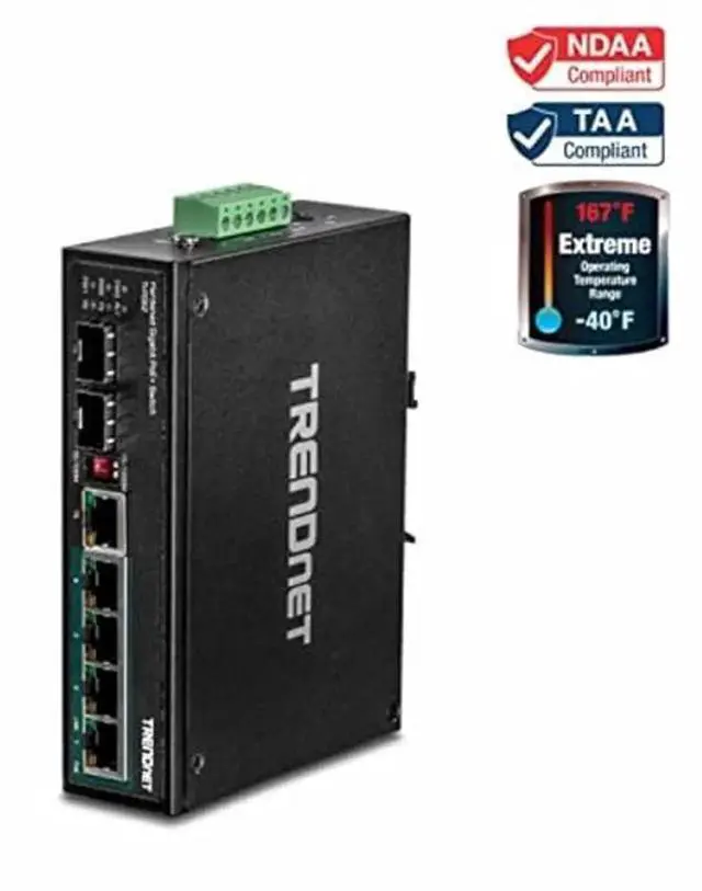 TRENDnets TI-PG62 is a reliable IP30 unmanaged DIN-rail PoE+ switch with a rugged housing rated for extreme industrial environments. It offers 4 Gigabit PoE+ ports, one shared Gigabit port (RJ-45 / SFP), one dedicated SFP slot, and a 12 Gbps switching capacity. Dual redundant power inputs and a power failure alarm relay. PoE Power A 120 Watt PoE+ power budget supplies up to four Power over Ethernet devices with PoE+ power. Fault Tolerance Features dual redundant power inputs (Primary and RPS) from external power sources and an output alarm relay to indicate the event of input power failure.