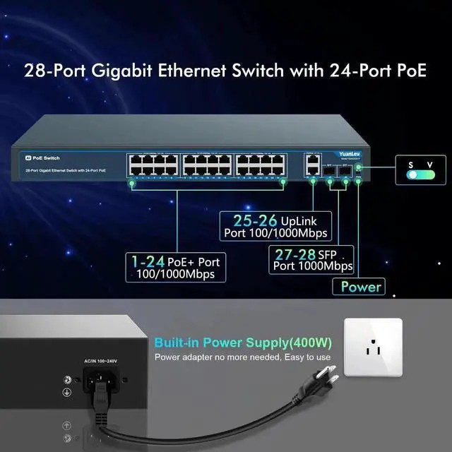 24 Port Gigabit Ethernet PoE Switch with 2 Uplink Gigabit Port & 2 SFP Port, YuanLey Unmanaged 24 Port PoE+ Network Switch, Rackmout, Build in 400W Power, Support 802.3 af/at, Plug and Play