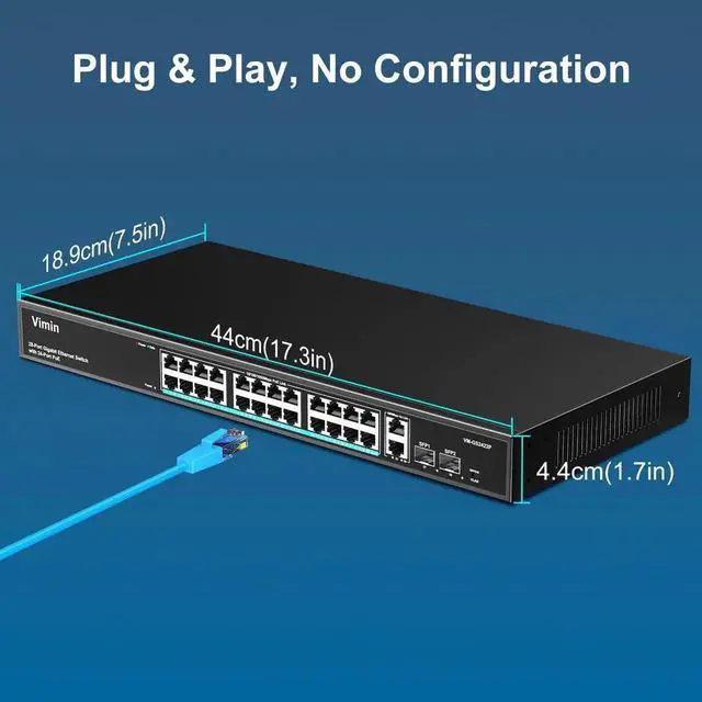 VIMIN 24 Port Gigabit PoE Switch with 2 Uplink Gigabit & 2 SFP Ports, 24-Port Ethernet PoE Switch Unmanaged w/ 320W High Power, Support IEEE802.3af/at, VLAN, Rack-Mount, Sturdy Metal Housing